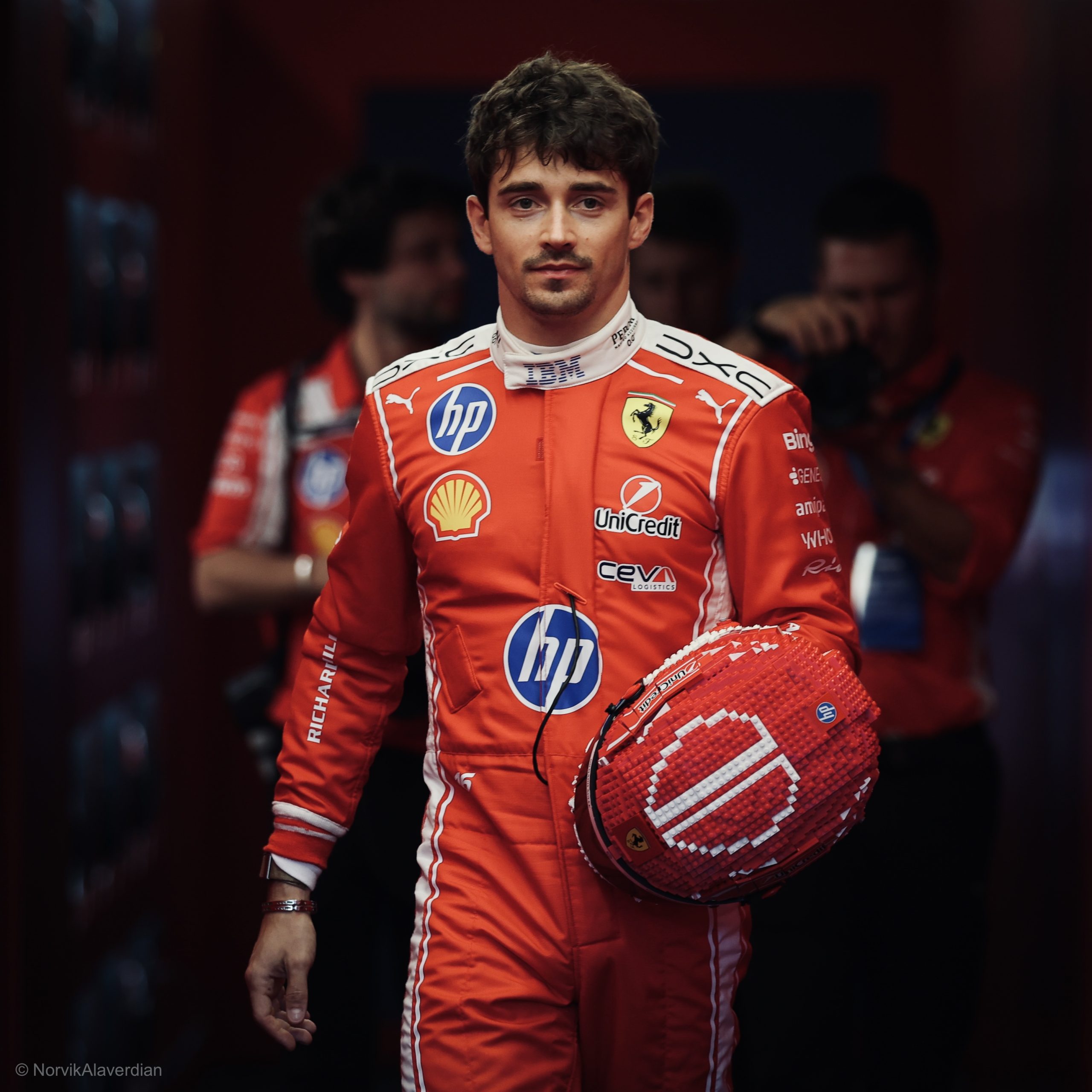 Charles Leclerc of Monaco and Scuderia Ferrari holds a LEGO helmet during previews ahead of the F1 Grand Prix of Australia at Albert Park Grand Prix Circuit in Melbourne